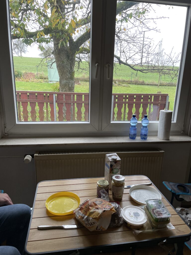 Mittags haben wir es uns (fast) bequem im Obergeschoss gemacht und zum ersten Mal in unserem Haus etwas zusammen gegessen. Warum nur fast bequem? Ihr seht nicht, dass es ziemlich frisch bei uns ist, sodass wir die Winterjacken anbehalten mussten. Trotzdem haben wir den Ausblick in den Garten sehr genossen und uns die Brötchen schmecken lassen.