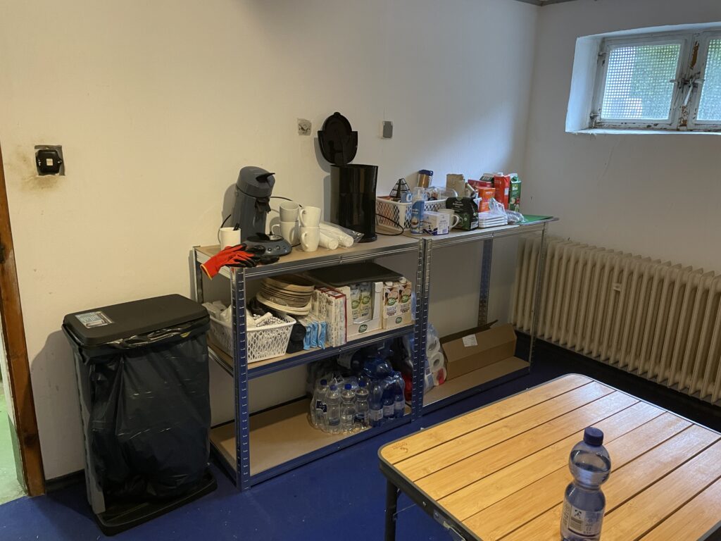 Lieferung vom Kühlschrank und der Bierzeltgarnitur erfolgreich gemeistert. Es gibt also kalte Getränke, (im Sommer Eis) und eine Sitzmöglichkeit während der Sanierung. Top!