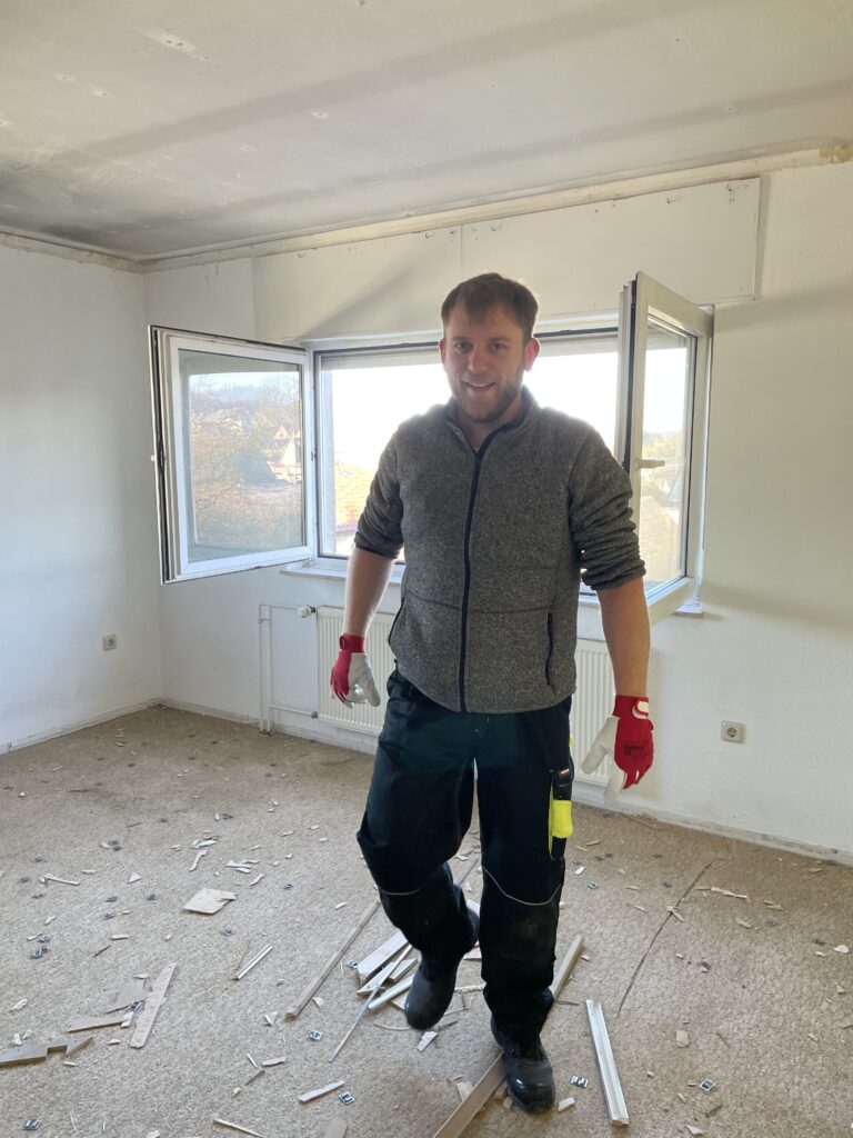 Zusammen mit fünf fleißigen Helfern ging es heute Morgen los. Getreu dem Motto: Tabula rasa – alles Holz muss raus, flogen Panele, Böden, Türe aus dem Fenster in den Container. Besonders spaßig war die Lattung unter den Decken- und Wandvertäfelungen, die einige Nerven gekostet haben. Schon gegen Mittag war der 10m³ große Container randvoll. Das weitere Holz wird dann in einem separaten Raum gelagert, bis der nächste Container Anfang nächster Woche geliefert wird. Auch in zwei Räumen haben wir die Tapete schon komplett entfernen können. Ein sehr erfolgreicher Tag, bei dem das Arbeiten dank der schönen Sonnenstunden noch viel mehr Spaß gemacht hat.