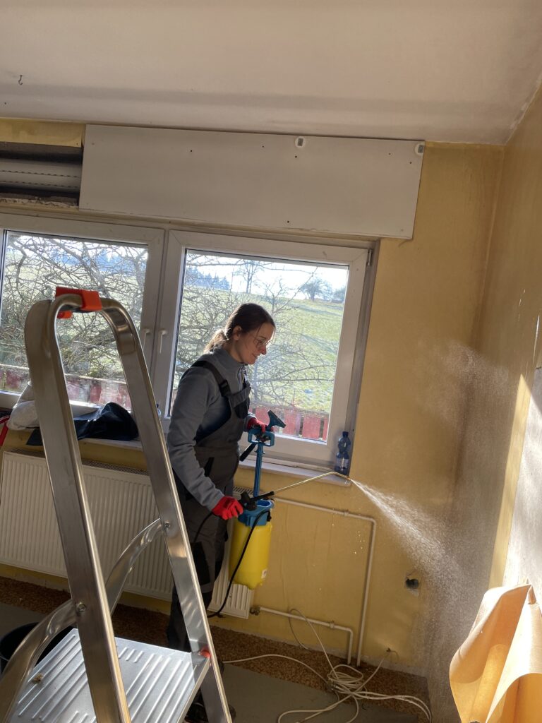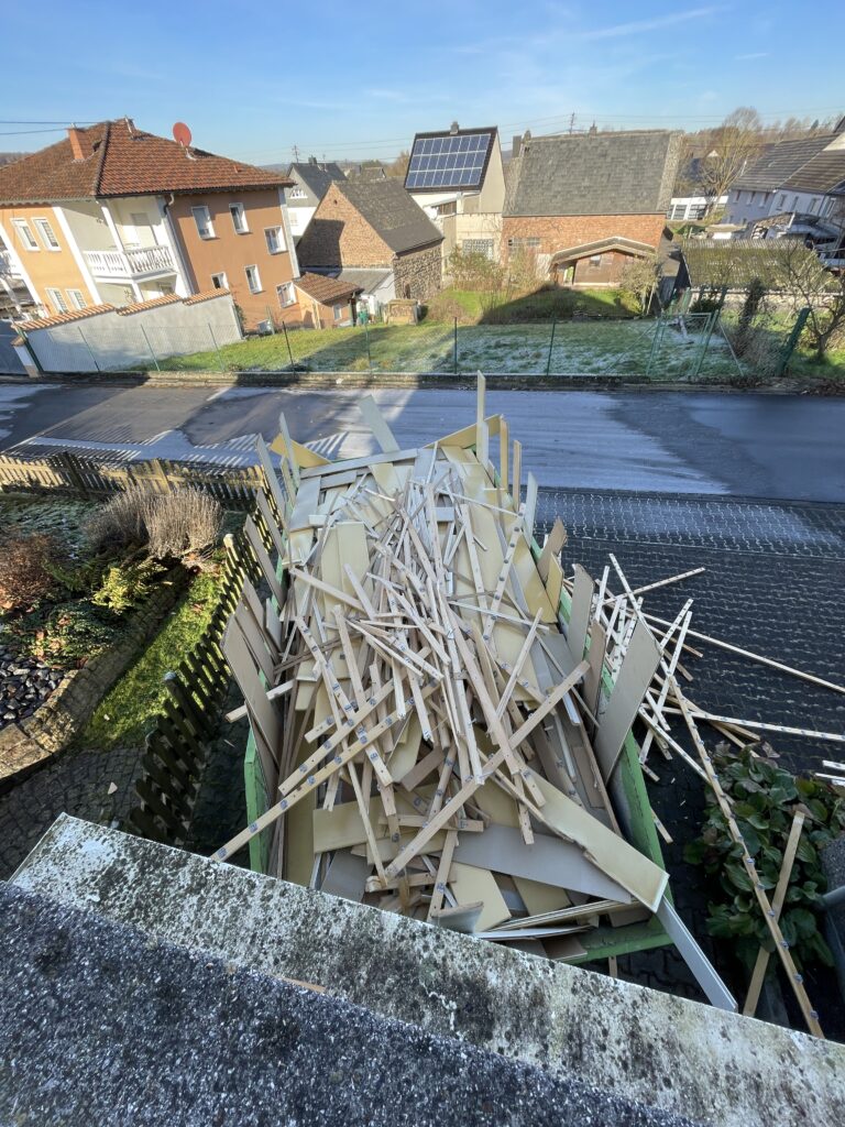 Heute gab es einen frühen Feierabend und dafür noch ein bisschen Zeit im Haus, um auch das Geländer von der Terrasse zu entfernen und den zweiten Container zu befüllen. Die nächsten 10m³ Holz werden also bald abgeholt und wir haben wieder etwas Platz geschaffen. Im vierten Raum wurde ebenfalls mit dem Tapete-Entfernen begonnen.